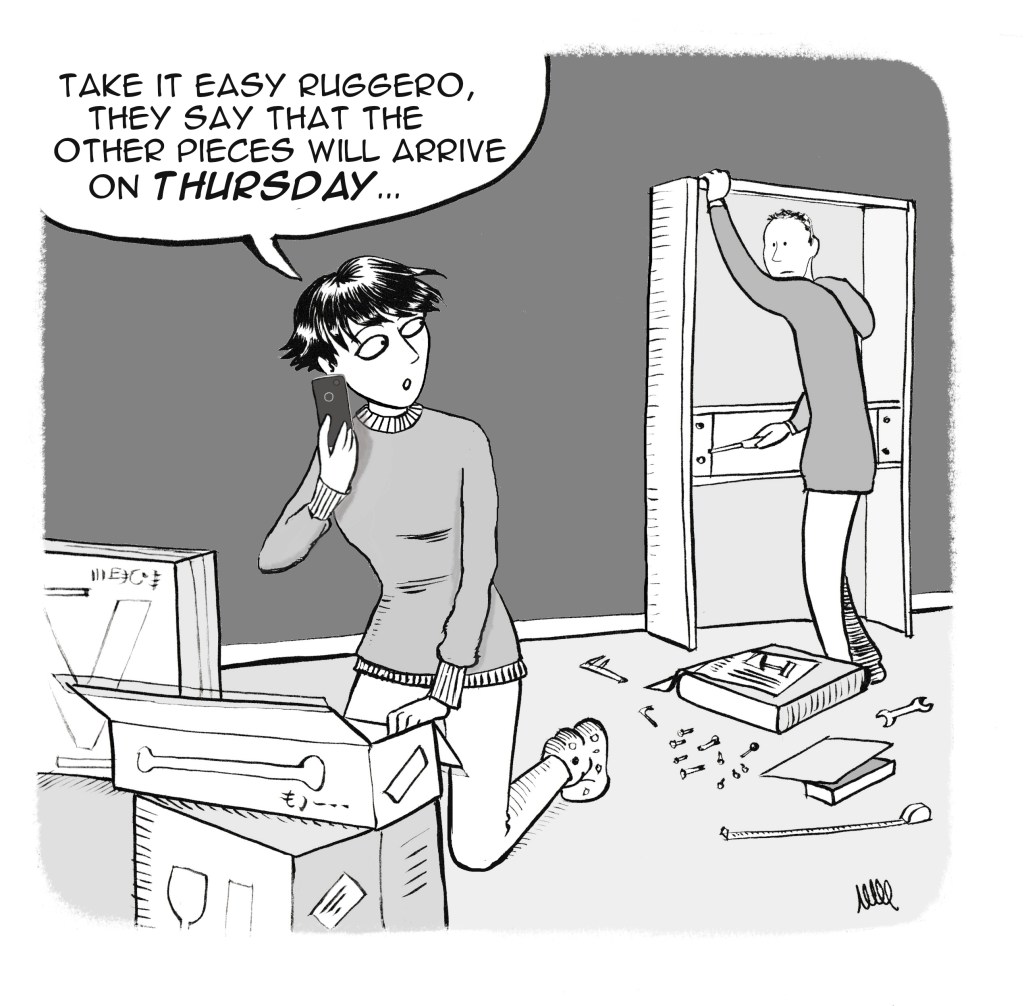 Quale può essere una soluzione brillante, in pieno Lockdown, se hai affittato una casa non ammobiliata e hai solo tre giorni per trasferirti, coi negozi chiusi e persino l’amata Ikea che fatica a consegnare? Comprare tutto su Amazon, ovviamente! È quello che abbiamo fatto, riuscendo a ricevere almeno un letto e un tavolo entro i primi due giorni e riempiendo la casa di cartoni, attrezzi e viti nei successivi dieci. Ciò che ci ha più colpito è stato il numero di scatole contenenti ciascuna una sola parte dello stesso mobile che arrivavano in giorni diversi. Ci è toccato spesso attendere l’intera consegna prima di iniziare a montare, con non poche implicazioni comiche. Adesso che ne stiamo finalmente venendo fuori, possiamo sederci sul nostro strano divano orgogliosi, tra l’altro, dell’immensa collezione di brugole. È il momento di complimentarci con noi stessi per la resilienza, e senza dubbio abilità, nell’aver ricevuto una casa in scatola e averla montata vite per vite in tempo record!